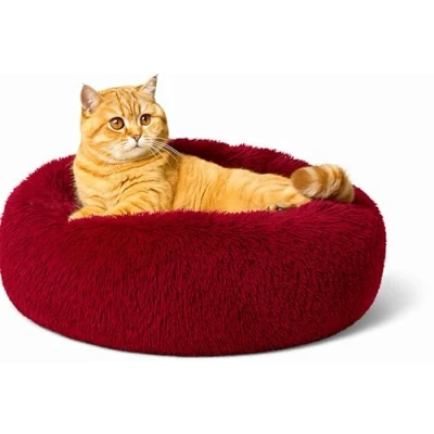 SEOUGEE Calming Donut Cat Bed, Fluffy Plush Round Dog Cosy Soft Washable Cushion Warming Pet Beds with Non Slip Bottom, Indoor Sleeping Cuddler Nest for Cats Puppy Kitten (Burgundy 40cm)