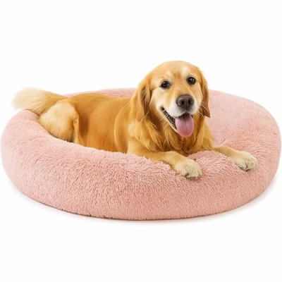 SEOUGEE Calming Donut Dog Bed, Fluffy Plush Round Cat Cosy Soft Washable Cushion Self Warming Pet Beds Non Slip Bottom, Indoor Sleeping Cuddler Nest for Medium Large Dogs (Dusty Pink 100cm)