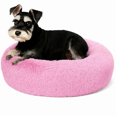 SEOUGEE Calming Donut Dog Bed, Fluffy Plush Round Cat Cosy Soft Washable Cushion Self Warming Pet Beds Non Slip Bottom, Indoor Sleeping Cuddler Nest for Small Medium Dogs (Light Pink 60cm)