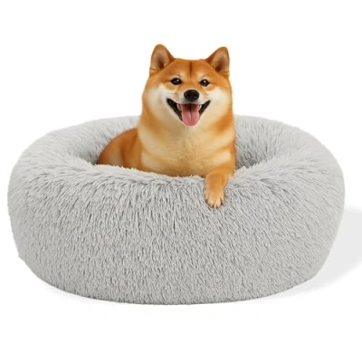 SEOUGEE Calming Donut Dog Bed, Fluffy Plush Round Cat Cosy Soft Washable Cushion Self Warming Pet Beds with Non Slip Bottom, Indoor Sleeping Cuddler Nest for Small Medium Dogs (Grey 60cm)