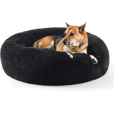 SEOUGEE Calming Donut Dog Bed, Fluffy Plush Round Cat Cosy Soft Washable Cushion Warming Pet Beds with Non Slip Bottom, Indoor Sleeping Cuddler Nest for Small Medium Dogs (Black 70cm)
