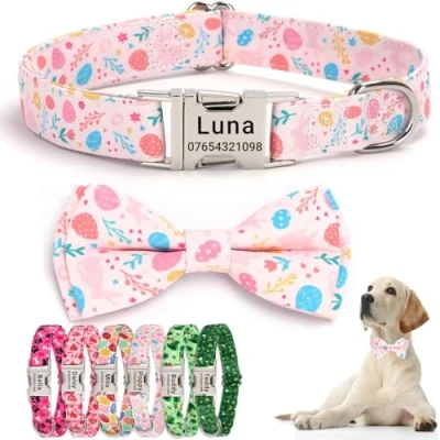 【Silent ID Tag with Personal Touch】 Say goodbye to jingling tags! Our Easter dog collar with bow tie features a sturdy, quiet metal buckle engraved with your dog’s name and contact info—keeping them safe and stylish without the noise. The durable ID tag ensures your pet's details are always visible and secure, making it ideal for festive outings and daily adventures. 【Perfect Fit for All Dogs - Small to XL】 Available in sizes XS to XL, our adjustable dog collars are crafted for every breed and size, from playful puppies to large loyal companions. The strong, adjustable buckle provides a secure yet comfortable fit for pets of all stages and sizes. Measure your pet’s neck for the best fit and give them a collar they’ll love to wear. 【Soft & Durable Cotton Material】 Made from high-quality cotton, our collar provides both durability and comfort for your pet, perfect for long wear. The soft fabric ensures it sits gently on your dog’s neck, reducing irritation for a more enjoyable experience, whether at home or on walks. 【Built for All-Weather Adventures】 While not water-resistant, the sturdy cotton construction of our collars is designed to withstand everyday wear and tear. The engraved metal buckle offers a touch of elegance and ensures your pet’s information stays clear and legible, ideal for both festive occasions and daily use. 【Eco-Friendly & Pet-Focused Design】 Crafted with eco-friendly materials, this collar supports both sustainability and style. If your dog ever outgrows their collar, repurpose it or donate to a shelter, extending its life for pets in need. Designed for dogs and responsible owners, this collar is a small step towards a brighter future for all pets.