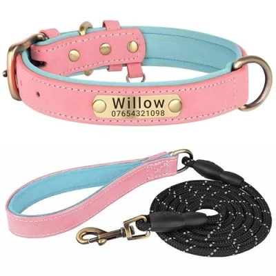 SEOUGEE Genuine Leather Dog Collar Personalised and Leash Set, Soft Padded Collars Heavy Duty with Custom Engraved Name Plate for Small Medium Large Dogs (XL, Pink Set 42 55cm)