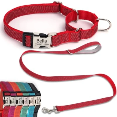 【Customised Safety with Personalised Metal Buckle】 This martingale dog collar comes with a durable, engraved metal nameplate featuring your dog’s name and your phone number. Unlike noisy, traditional dangling tags, our flat ID tag stays secure and quiet, preventing loss and reducing irritation. It’s a stylish and safer choice for your beloved pet, suitable for small, medium, and large dogs. 【Enhanced Safety with Reflective Nylon Design】 Both the collar and the 150cm (1.5m) lead leash are crafted with starry reflective nylon, making your dog visible during evening walks or low-light conditions. This reflective feature not only boosts safety but also adds a sleek, modern touch to your dog’s gear, ideal for walking, training, and everyday adventures. 【Comfortable Walks with Soft-Padded Handle】 Our leash is designed with a soft-padded handle, offering comfort and protection to your hands during walks, training, or running sessions. No more discomfort or strain, even if your dog pulls. It’s perfect for all-day use, letting you enjoy long outings with your active pet. 【Anti-Pull, Escape-Proof Martingale Design】 The collar’s figure-8 martingale design gently tightens when your dog pulls, providing gentle correction without choking, and preventing escapes. It’s an effective training tool that offers secure control, making it essential for leash training curious puppies, energetic medium breeds, and strong large dogs. 【Durable and Versatile for Training and Play】 Made with high-strength nylon and reinforced stitching, this reflective dog collar is built to last. The heavy-duty metal D-ring allows secure leash attachment, making it ideal for walking, running, and training. Whether used as an anti-pull collar or an everyday accessory, it’s designed for safety, style, and functionality.