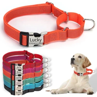 【Personalised Metal Buckle with Engraved Details】 Customise your martingale dog collar with your pet’s name and your phone number on a durable, engraved metal nameplate. Unlike traditional dangling tags, this flat ID tag design eliminates noise, prevents loss, and reduces irritation, offering a safer and more stylish option for your dog. Perfect for small, medium, and large dogs. 【Reflective Nylon for Enhanced Safety】 Designed with high-brightness reflective stitching, this adjustable martingale collar keeps your dog visible during evening walks and low-light conditions. The reflective feature ensures safety while adding a modern touch, making it ideal for walking, training, and daily adventures. 【Anti-Pull and Escape-Proof Martingale Design】 The figure-8 martingale design gently tightens when your dog pulls, providing gentle correction and preventing escapes. Perfect for leash training, this collar offers secure control without choking, making it an essential tool for puppies, medium breeds, and large breeds alike. 【Adjustable Fit for Small to Large Dogs】 Available in sizes Small (S) to Large (L), this personalised dog collar is fully adjustable for a comfortable and secure fit. Crafted from lightweight nylon, it’s perfect for daily wear, offering durability and comfort for playful puppies, active pets, and well-trained dogs. 【Durable and Versatile for Training and Play】 Made with high-strength nylon and reinforced stitching, this reflective dog collar is built to last. The heavy-duty metal D-ring allows secure leash attachment, making it ideal for walking, running, and training. Whether used as an anti-pull collar or an everyday accessory, it’s designed for safety, style, and functionality.
