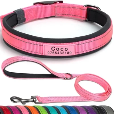 【Customised for safety & style】 Personalise your dog’s collar with their name and your phone number, and a unique design, ensuring they’re easily identifiable if lost. Say goodbye to noisy tags and hello to a sleek, durable, secure solution for your furry friend. 【Ultra wide soft neoprene padded】 Designed for ultimate comfort, our collar features a thick, wide neoprene lining that’s very plush on your dog’s neck. Perfect for active dogs, it prevents irritation and provides a snug fit during walks, training, or playtime. 【Reflective & durable design】 Built with visibility reflective stitching and a heavy-duty metal buckle, this collar ensures your dog’s safety during nighttime walks while offering unmatched durability and strength for even the most energetic and active pups. 【Adjustable & comfortable fit】Available in sizes S, M, L, and XL, our collar is fully adjustable to fit most breeds. The soft neoprene padding and lightweight design ensure comfort and ease, making it ideal for daily wear, whether for small puppies or large dogs. 【Vibrant colors & personalisation】Choose from a variety of colors like pink, purple, blue, grey, black, green, orange, and red to match dog’s personality. Customise the collar to make your pup stand out while keeping them safe and comfortable.