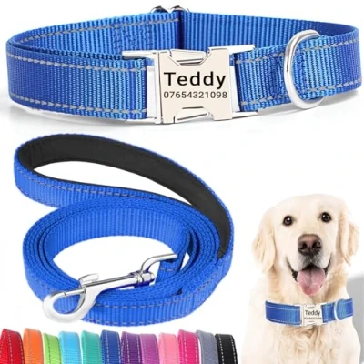 【Quiet Metal Buckle ID Tag】Our dog collar features a sturdy metal buckle ID tag that eliminates the noise of traditional dangling tags. Customize it with your dog’s name and your contact details for a personal touch. The engraved information ensures lasting visibility without fading, and the buckle's secure fit keeps your pet comfortable. 【Matching Lead for Complete Control】This personalized dog collar comes with a 150cm matching lead, designed for durability and comfort. The leash is made of the same strong, reflective nylon for enhanced visibility during walks, ensuring you and your pet stay safe and stylish no matter the time of day. 【Perfect Fit for Every Breed】Available in a variety of sizes, our adjustable dog collar and lead set is perfect for any dog, from tiny Chihuahuas to large Labradors. The adjustable buckle provides a secure and comfortable fit, while the leash length is ideal for both casual strolls and more active adventures. Measure your dog’s neck to ensure the best fit. 【Enhanced Visibility & Strength】Both the collar and lead feature high-visibility reflective stitching, perfect for evening walks or low-light conditions. Made from durable, water-resistant nylon, this set is built to withstand the elements, ensuring both comfort and security for your pet, whether you're indoors or outdoors. 【Eco-Friendly & Thoughtful Design】This collar and lead set is designed with sustainability in mind. While the metal buckle ID tag is long-lasting, consider repurposing the set if your dog outgrows it. Alternatively, donate it to a shelter for larger dogs in need, promoting responsible pet ownership and contributing to a greener future.