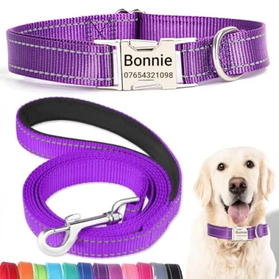 【Quiet Metal Buckle ID Tag】Our dog collar features a sturdy metal buckle ID tag that eliminates the noise of traditional dangling tags. Customize it with your dog’s name and your contact details for a personal touch. The engraved information ensures lasting visibility without fading, and the buckle's secure fit keeps your pet comfortable. 【Matching Lead for Complete Control】This personalized dog collar comes with a 150cm matching lead, designed for durability and comfort. The leash is made of the same strong, reflective nylon for enhanced visibility during walks, ensuring you and your pet stay safe and stylish no matter the time of day. 【Perfect Fit for Every Breed】Available in a variety of sizes, our adjustable dog collar and lead set is perfect for any dog, from tiny Chihuahuas to large Labradors. The adjustable buckle provides a secure and comfortable fit, while the leash length is ideal for both casual strolls and more active adventures. Measure your dog’s neck to ensure the best fit. 【Enhanced Visibility & Strength】Both the collar and lead feature high-visibility reflective stitching, perfect for evening walks or low-light conditions. Made from durable, water-resistant nylon, this set is built to withstand the elements, ensuring both comfort and security for your pet, whether you're indoors or outdoors. 【Eco-Friendly & Thoughtful Design】This collar and lead set is designed with sustainability in mind. While the metal buckle ID tag is long-lasting, consider repurposing the set if your dog outgrows it. Alternatively, donate it to a shelter for larger dogs in need, promoting responsible pet ownership and contributing to a greener future.