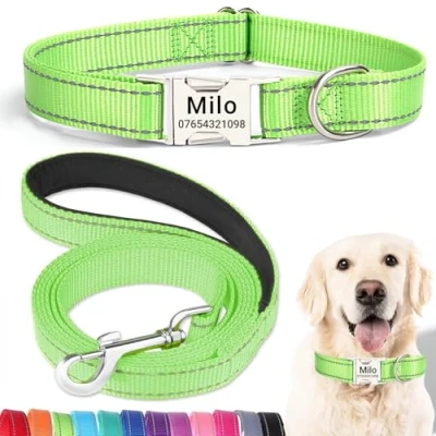 【Quiet Metal Buckle ID Tag】Our dog collar features a sturdy metal buckle ID tag that eliminates the noise of traditional dangling tags. Customize it with your dog’s name and your contact details for a personal touch. The engraved information ensures lasting visibility without fading, and the buckle's secure fit keeps your pet comfortable. 【Matching Lead for Complete Control】This personalized dog collar comes with a 150cm matching lead, designed for durability and comfort. The leash is made of the same strong, reflective nylon for enhanced visibility during walks, ensuring you and your pet stay safe and stylish no matter the time of day. 【Perfect Fit for Every Breed】Available in a variety of sizes, our adjustable dog collar and lead set is perfect for any dog, from tiny Chihuahuas to large Labradors. The adjustable buckle provides a secure and comfortable fit, while the leash length is ideal for both casual strolls and more active adventures. Measure your dog’s neck to ensure the best fit. 【Enhanced Visibility & Strength】Both the collar and lead feature high-visibility reflective stitching, perfect for evening walks or low-light conditions. Made from durable, water-resistant nylon, this set is built to withstand the elements, ensuring both comfort and security for your pet, whether you're indoors or outdoors. 【Eco-Friendly & Thoughtful Design】This collar and lead set is designed with sustainability in mind. While the metal buckle ID tag is long-lasting, consider repurposing the set if your dog outgrows it. Alternatively, donate it to a shelter for larger dogs in need, promoting responsible pet ownership and contributing to a greener future.