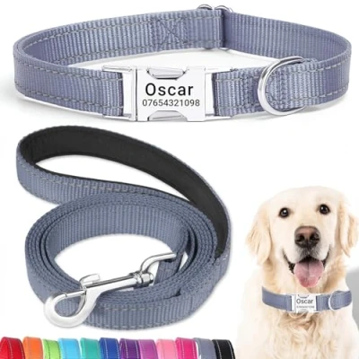 SEOUGEE Personalised Dog Collar and Lead Set with Engraved Metal Buckle, Reflective Nylon Collars Leash for Large Dogs Custom Name Plate Phone Number (Grey Set, L:Neck 40 60cm)