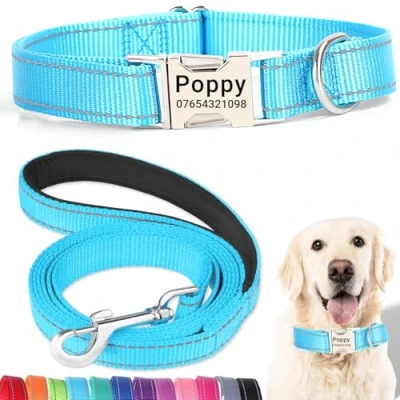 【Quiet Metal Buckle ID Tag】Our dog collar features a sturdy metal buckle ID tag that eliminates the noise of traditional dangling tags. Customize it with your dog’s name and your contact details for a personal touch. The engraved information ensures lasting visibility without fading, and the buckle's secure fit keeps your pet comfortable. 【Matching Lead for Complete Control】This personalized dog collar comes with a 150cm matching lead, designed for durability and comfort. The leash is made of the same strong, reflective nylon for enhanced visibility during walks, ensuring you and your pet stay safe and stylish no matter the time of day. 【Perfect Fit for Every Breed】Available in a variety of sizes, our adjustable dog collar and lead set is perfect for any dog, from tiny Chihuahuas to large Labradors. The adjustable buckle provides a secure and comfortable fit, while the leash length is ideal for both casual strolls and more active adventures. Measure your dog’s neck to ensure the best fit. 【Enhanced Visibility & Strength】Both the collar and lead feature high-visibility reflective stitching, perfect for evening walks or low-light conditions. Made from durable, water-resistant nylon, this set is built to withstand the elements, ensuring both comfort and security for your pet, whether you're indoors or outdoors. 【Eco-Friendly & Thoughtful Design】This collar and lead set is designed with sustainability in mind. While the metal buckle ID tag is long-lasting, consider repurposing the set if your dog outgrows it. Alternatively, donate it to a shelter for larger dogs in need, promoting responsible pet ownership and contributing to a greener future.
