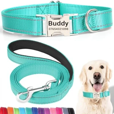【Quiet Metal Buckle ID Tag】Our dog collar features a sturdy metal buckle ID tag that eliminates the noise of traditional dangling tags. Customize it with your dog’s name and your contact details for a personal touch. The engraved information ensures lasting visibility without fading, and the buckle's secure fit keeps your pet comfortable. 【Matching Lead for Complete Control】This personalized dog collar comes with a 150cm matching lead, designed for durability and comfort. The leash is made of the same strong, reflective nylon for enhanced visibility during walks, ensuring you and your pet stay safe and stylish no matter the time of day. 【Perfect Fit for Every Breed】Available in a variety of sizes, our adjustable dog collar and lead set is perfect for any dog, from tiny Chihuahuas to large Labradors. The adjustable buckle provides a secure and comfortable fit, while the leash length is ideal for both casual strolls and more active adventures. Measure your dog’s neck to ensure the best fit. 【Enhanced Visibility & Strength】Both the collar and lead feature high-visibility reflective stitching, perfect for evening walks or low-light conditions. Made from durable, water-resistant nylon, this set is built to withstand the elements, ensuring both comfort and security for your pet, whether you're indoors or outdoors. 【Eco-Friendly & Thoughtful Design】This collar and lead set is designed with sustainability in mind. While the metal buckle ID tag is long-lasting, consider repurposing the set if your dog outgrows it. Alternatively, donate it to a shelter for larger dogs in need, promoting responsible pet ownership and contributing to a greener future.