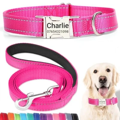 【Quiet Metal Buckle ID Tag】Our dog collar features a sturdy metal buckle ID tag that eliminates the noise of traditional dangling tags. Customize it with your dog’s name and your contact details for a personal touch. The engraved information ensures lasting visibility without fading, and the buckle's secure fit keeps your pet comfortable. 【Matching Lead for Complete Control】This personalized dog collar comes with a 150cm matching lead, designed for durability and comfort. The leash is made of the same strong, reflective nylon for enhanced visibility during walks, ensuring you and your pet stay safe and stylish no matter the time of day. 【Perfect Fit for Every Breed】Available in a variety of sizes, our adjustable dog collar and lead set is perfect for any dog, from tiny Chihuahuas to large Labradors. The adjustable buckle provides a secure and comfortable fit, while the leash length is ideal for both casual strolls and more active adventures. Measure your dog’s neck to ensure the best fit. 【Enhanced Visibility & Strength】Both the collar and lead feature high-visibility reflective stitching, perfect for evening walks or low-light conditions. Made from durable, water-resistant nylon, this set is built to withstand the elements, ensuring both comfort and security for your pet, whether you're indoors or outdoors. 【Eco-Friendly & Thoughtful Design】This collar and lead set is designed with sustainability in mind. While the metal buckle ID tag is long-lasting, consider repurposing the set if your dog outgrows it. Alternatively, donate it to a shelter for larger dogs in need, promoting responsible pet ownership and contributing to a greener future.