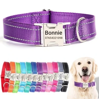 【Quiet Metal Buckle ID Tag】🏷️Our dog collars feature a sturdy metal buckle ID tag that ensures peace and quiet, eliminating the noise of traditional dangling tags. Custom engrave your dog’s name and your contact details on the tag for a personal touch that's both stylish and functional, ensuring they stand out without fading or dyeing your pet's fur. 【Perfect Fit for Every Breed】📏With sizes ranging from XS to XL, our adjustable dog collars are designed to fit every stage of your dog’s life. The robust, adjustable buckle provides a secure fit for breeds as small as the playful Chihuahua to as large as the loyal Labrador. Remember to measure your dog's neck for a comfortable and safe fit. 【Enhanced Visibility and Strength】🌟Our collars are built with high-visibility reflective stitching for safe evening walks, paired with high-quality, durable nylon that's built to last. Your dog's comfort and safety are paramount, and our collars are designed to ensure just that—day or night, rain or shine. 【Durable & Water-Resistant】🐾 Tailored for both indoor coziness and outdoor ruggedness, our collars resist water and weather, making them ideal for adventurous pets. The customizable metal ID buckle adds a touch of elegance and ensures your pet's information is always visible, no matter where their explorations take them. 【Eco-Friendly & Socially Conscious】🐶Embrace sustainability with our dog collars. While the personalized metal buckle is designed to stay securely with your dog for a lifetime, we champion responsible ownership. If your dog outgrows their collar, consider repurposing it creatively or donating to animal shelters for larger dogs in need, as a commitment to our environment and the well-being of all pets.
