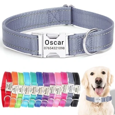 【Quiet Metal Buckle ID Tag】🏷️Our dog collars feature a sturdy metal buckle ID tag that ensures peace and quiet, eliminating the noise of traditional dangling tags. Custom engrave your dog’s name and your contact details on the tag for a personal touch that's both stylish and functional, ensuring they stand out without fading or dyeing your pet's fur. 【Perfect Fit for Every Breed】📏With sizes ranging from XS to XL, our adjustable dog collars are designed to fit every stage of your dog’s life. The robust, adjustable buckle provides a secure fit for breeds as small as the playful Chihuahua to as large as the loyal Labrador. Remember to measure your dog's neck for a comfortable and safe fit. 【Enhanced Visibility and Strength】🌟Our collars are built with high-visibility reflective stitching for safe evening walks, paired with high-quality, durable nylon that's built to last. Your dog's comfort and safety are paramount, and our collars are designed to ensure just that—day or night, rain or shine. 【Durable & Water-Resistant】🐾 Tailored for both indoor coziness and outdoor ruggedness, our collars resist water and weather, making them ideal for adventurous pets. The customizable metal ID buckle adds a touch of elegance and ensures your pet's information is always visible, no matter where their explorations take them. 【Eco-Friendly & Socially Conscious】🐶Embrace sustainability with our dog collars. While the personalized metal buckle is designed to stay securely with your dog for a lifetime, we champion responsible ownership. If your dog outgrows their collar, consider repurposing it creatively or donating to animal shelters for larger dogs in need, as a commitment to our environment and the well-being of all pets.