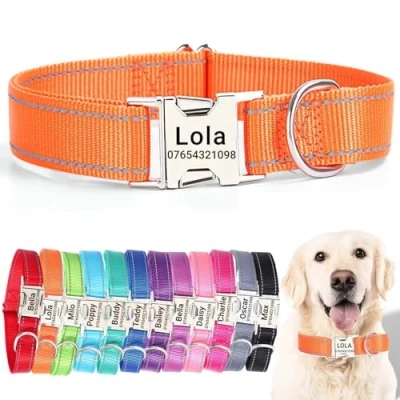 【Quiet Metal Buckle ID Tag】🏷️Our dog collars feature a sturdy metal buckle ID tag that ensures peace and quiet, eliminating the noise of traditional dangling tags. Custom engrave your dog’s name and your contact details on the tag for a personal touch that's both stylish and functional, ensuring they stand out without fading or dyeing your pet's fur. 【Perfect Fit for Every Breed】📏With sizes ranging from XS to XL, our adjustable dog collars are designed to fit every stage of your dog’s life. The robust, adjustable buckle provides a secure fit for breeds as small as the playful Chihuahua to as large as the loyal Labrador. Remember to measure your dog's neck for a comfortable and safe fit. 【Enhanced Visibility and Strength】🌟Our collars are built with high-visibility reflective stitching for safe evening walks, paired with high-quality, durable nylon that's built to last. Your dog's comfort and safety are paramount, and our collars are designed to ensure just that—day or night, rain or shine. 【Durable & Water-Resistant】🐾 Tailored for both indoor coziness and outdoor ruggedness, our collars resist water and weather, making them ideal for adventurous pets. The customizable metal ID buckle adds a touch of elegance and ensures your pet's information is always visible, no matter where their explorations take them. 【Eco-Friendly & Socially Conscious】🐶Embrace sustainability with our dog collars. While the personalized metal buckle is designed to stay securely with your dog for a lifetime, we champion responsible ownership. If your dog outgrows their collar, consider repurposing it creatively or donating to animal shelters for larger dogs in need, as a commitment to our environment and the well-being of all pets.
