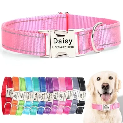 【Quiet Metal Buckle ID Tag】🏷️Our dog collars feature a sturdy metal buckle ID tag that ensures peace and quiet, eliminating the noise of traditional dangling tags. Custom engrave your dog’s name and your contact details on the tag for a personal touch that's both stylish and functional, ensuring they stand out without fading or dyeing your pet's fur. 【Perfect Fit for Every Breed】📏With sizes ranging from XS to XL, our adjustable dog collars are designed to fit every stage of your dog’s life. The robust, adjustable buckle provides a secure fit for breeds as small as the playful Chihuahua to as large as the loyal Labrador. Remember to measure your dog's neck for a comfortable and safe fit. 【Enhanced Visibility and Strength】🌟Our collars are built with high-visibility reflective stitching for safe evening walks, paired with high-quality, durable nylon that's built to last. Your dog's comfort and safety are paramount, and our collars are designed to ensure just that—day or night, rain or shine. 【Durable & Water-Resistant】🐾 Tailored for both indoor coziness and outdoor ruggedness, our collars resist water and weather, making them ideal for adventurous pets. The customizable metal ID buckle adds a touch of elegance and ensures your pet's information is always visible, no matter where their explorations take them. 【Eco-Friendly & Socially Conscious】🐶Embrace sustainability with our dog collars. While the personalized metal buckle is designed to stay securely with your dog for a lifetime, we champion responsible ownership. If your dog outgrows their collar, consider repurposing it creatively or donating to animal shelters for larger dogs in need, as a commitment to our environment and the well-being of all pets.