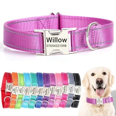 【Quiet Metal Buckle ID Tag】🏷️Our dog collars feature a sturdy metal buckle ID tag that ensures peace and quiet, eliminating the noise of traditional dangling tags. Custom engrave your dog’s name and your contact details on the tag for a personal touch that's both stylish and functional, ensuring they stand out without fading or dyeing your pet's fur. 【Perfect Fit for Every Breed】📏With sizes ranging from XS to XL, our adjustable dog collars are designed to fit every stage of your dog’s life. The robust, adjustable buckle provides a secure fit for breeds as small as the playful Chihuahua to as large as the loyal Labrador. Remember to measure your dog's neck for a comfortable and safe fit. 【Enhanced Visibility and Strength】🌟Our collars are built with high-visibility reflective stitching for safe evening walks, paired with high-quality, durable nylon that's built to last. Your dog's comfort and safety are paramount, and our collars are designed to ensure just that—day or night, rain or shine. 【Durable & Water-Resistant】🐾 Tailored for both indoor coziness and outdoor ruggedness, our collars resist water and weather, making them ideal for adventurous pets. The customizable metal ID buckle adds a touch of elegance and ensures your pet's information is always visible, no matter where their explorations take them. 【Eco-Friendly & Socially Conscious】🐶Embrace sustainability with our dog collars. While the personalized metal buckle is designed to stay securely with your dog for a lifetime, we champion responsible ownership. If your dog outgrows their collar, consider repurposing it creatively or donating to animal shelters for larger dogs in need, as a commitment to our environment and the well-being of all pets.