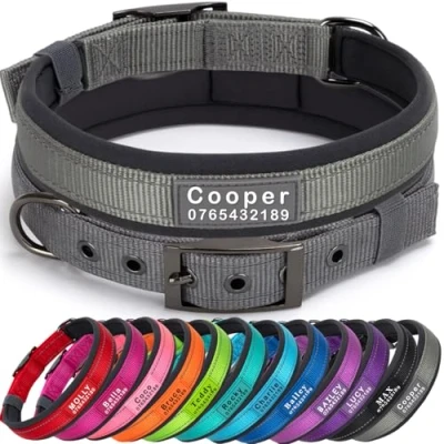 【Customised for safety & style】 Personalise your dog’s collar with their name and your phone number, and a unique design, ensuring they’re easily identifiable if lost. Say goodbye to noisy tags and hello to a sleek, durable, secure solution for your furry friend. 【Ultra wide soft neoprene padded】 Designed for ultimate comfort, our collar features a thick, wide neoprene lining that’s very plush on your dog’s neck. Perfect for active dogs, it prevents irritation and provides a snug fit during walks, training, or playtime. 【Reflective & durable design】 Built with visibility reflective stitching and a heavy-duty metal buckle, this collar ensures your dog’s safety during nighttime walks while offering unmatched durability and strength for even the most energetic and active pups. 【Adjustable & comfortable fit】Available in sizes S, M, L, and XL, our collar is fully adjustable to fit most breeds. The soft neoprene padding and lightweight design ensure comfort and ease, making it ideal for daily wear, whether for small puppies or large dogs. 【Vibrant colors & personalisation】Choose from a variety of colors like pink, purple, blue, grey, black, green, orange, and red to match dog’s personality. Customise the collar to make your pup stand out while keeping them safe and comfortable.