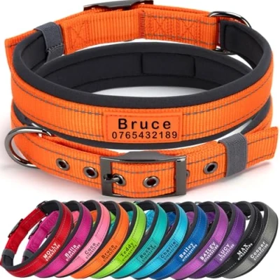 【Customised for safety & style】 Personalise your dog’s collar with their name and your phone number, and a unique design, ensuring they’re easily identifiable if lost. Say goodbye to noisy tags and hello to a sleek, durable, secure solution for your furry friend. 【Ultra wide soft neoprene padded】 Designed for ultimate comfort, our collar features a thick, wide neoprene lining that’s very plush on your dog’s neck. Perfect for active dogs, it prevents irritation and provides a snug fit during walks, training, or playtime. 【Reflective & durable design】 Built with visibility reflective stitching and a heavy-duty metal buckle, this collar ensures your dog’s safety during nighttime walks while offering unmatched durability and strength for even the most energetic and active pups. 【Adjustable & comfortable fit】Available in sizes S, M, L, and XL, our collar is fully adjustable to fit most breeds. The soft neoprene padding and lightweight design ensure comfort and ease, making it ideal for daily wear, whether for small puppies or large dogs. 【Vibrant colors & personalisation】Choose from a variety of colors like pink, purple, blue, grey, black, green, orange, and red to match dog’s personality. Customise the collar to make your pup stand out while keeping them safe and comfortable.