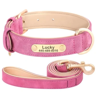 SEOUGEE Personalised Leather Dog Collar and Leash Set, Soft Padded Collars Heavy Duty with Custom Engraved Name Plate Adjustable for Small Medium Large Dogs (XL, Rose Set 42 55cm)
