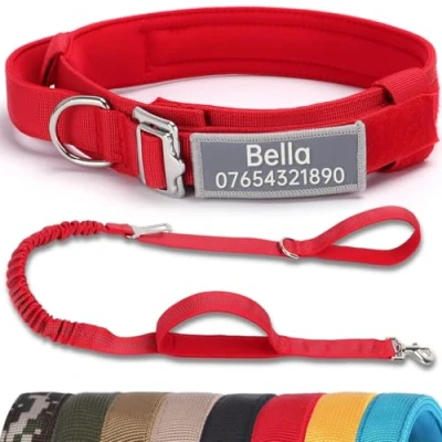 SEOUGEE Tactical Dog Collar Personalised with Handle and Leash Set, Soft Padded Collars Custom Reflective Name Patch, Pet Portable Buckle for Medium Large Dogs (Red XL)
