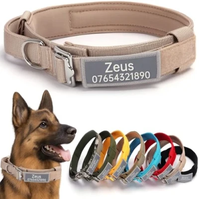 【Built to Last – Tough Yet Comfortable】Made from durable military-grade nylon with reinforced stitching, this collar is built for dogs who love to train, hike or work outdoors. The soft padded neoprene lining offers comfort and protects skin from irritation or matting. Perfect for daily walks, field use or training strong breeds like Labs, Staffies or German Shepherds. Lightweight but tough — made for adventure. 【Secure Metal Buckle & Easy Adjustment】This tactical dog collar features a strong interlocking metal buckle that stays secure even under heavy pulling. Unlike plastic clips, it offers a safer, longer-lasting hold. Easily adjustable for the perfect fit, whether you’re walking, training or working. Ideal for powerful breeds like Rottweilers, Bulldogs, and other medium to large dogs. 【Custom Reflective ID Patch】Includes a personalised reflective patch where your dog’s name and your phone number can be engraved. No noisy tags to fall off — just reliable visibility and easy identification on walks, runs or in the dark. Safer for dogs that go off-lead or work outdoors. Great for pet owners who want peace of mind without sacrificing durability. 【Adjustable Fit – S to XL, 8 Colours】Available in 4 sizes: S (30–35cm), M (35–42cm), L (42–50cm), XL (50–60cm), and 8 colours including Army Green, Greenuflage, Black, Beige, Red and more. Collar width: 3.8cm (S is 3cm). Easy to adjust and designed to suit most medium and large dogs. Stylish, practical, and made to perform in all conditions. 【Everyday Use & Outdoor Ready】Whether it’s a morning walk, off-lead hike, or obedience session, this collar is ready. Ideal for daily walking, training, working dogs and active pets. Strong enough for tactical or rescue use, yet comfortable for long wear. Suitable for breeds like Huskies, Retrievers, Malinois, Dobermans and more.
