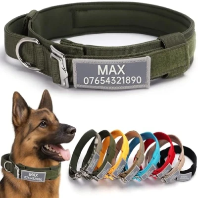 【Built to Last – Tough Yet Comfortable】Made from durable military-grade nylon with reinforced stitching, this collar is built for dogs who love to train, hike or work outdoors. The soft padded neoprene lining offers comfort and protects skin from irritation or matting. Perfect for daily walks, field use or training strong breeds like Labs, Staffies or German Shepherds. Lightweight but tough — made for adventure. 【Secure Metal Buckle & Easy Adjustment】This tactical dog collar features a strong interlocking metal buckle that stays secure even under heavy pulling. Unlike plastic clips, it offers a safer, longer-lasting hold. Easily adjustable for the perfect fit, whether you’re walking, training or working. Ideal for powerful breeds like Rottweilers, Bulldogs, and other medium to large dogs. 【Custom Reflective ID Patch】Includes a personalised reflective patch where your dog’s name and your phone number can be engraved. No noisy tags to fall off — just reliable visibility and easy identification on walks, runs or in the dark. Safer for dogs that go off-lead or work outdoors. Great for pet owners who want peace of mind without sacrificing durability. 【Adjustable Fit – S to XL, 8 Colours】Available in 4 sizes: S (30–35cm), M (35–42cm), L (42–50cm), XL (50–60cm), and 8 colours including Army Green, Greenuflage, Black, Beige, Red and more. Collar width: 3.8cm (S is 3cm). Easy to adjust and designed to suit most medium and large dogs. Stylish, practical, and made to perform in all conditions. 【Everyday Use & Outdoor Ready】Whether it’s a morning walk, off-lead hike, or obedience session, this collar is ready. Ideal for daily walking, training, working dogs and active pets. Strong enough for tactical or rescue use, yet comfortable for long wear. Suitable for breeds like Huskies, Retrievers, Malinois, Dobermans and more.