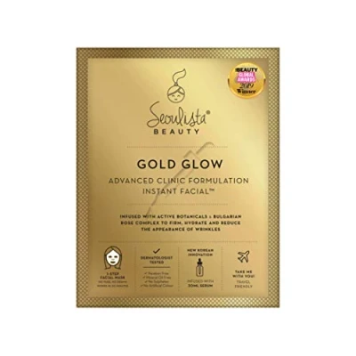 Seoulista Beauty Advanced Clinic Formulation Gold Glow Instant Facial Anti Ageing Face Mask —With Bulgarian Rose Oil, Vitamin C, Niacinamide — Dermatologist Created Globally Award Winning