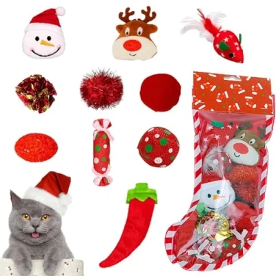 Festive Variety: Elevate your cat's Christmas with our 10-piece Kitten Toys set in charming stockings. Featuring wrinkle balls, mice, Santa Claus, elk, candy, and furballs, it offers a diverse range for play and training. Safety First: Crafted from pet-safe, eco-friendly materials like rope, plastic, plush, and cotton, these toys ensure a secure and enjoyable playtime. Endless Amusement: Provide your cat with hours of exercise and joy with our thoughtfully curated variety pack. The vibrant Christmas-themed toys promise captivating entertainment. Perfect Gift Presentation: The festive stocking packaging and vibrant colours make it an ideal Christmas gift for your feline friend.