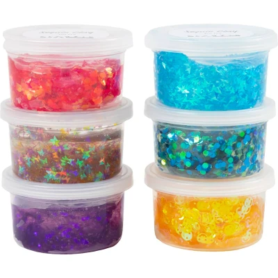 Sequin Modelling Clay – Blue/Green & Purple/Pink Mix (6 x 60 g). This transparent sequin modelling clay adds instant sparkle and texture to creative projects. Filled with eye-catching sequins in playful shapes, it creates decorative effects that stand out beautifully once applied.. The smooth, spreadable consistency makes it easy to apply in thin layers, allowing the sequins to shine clearly through the transparent base. It adheres well to a wide range of surfaces, making it a versatile choice for both decorative and mixed media projects.. The clay sets to a firm finish in a short time, helping you complete projects efficiently. If it begins to dry while working, a small amount of water can be added to restore flexibility.. Ideal for:. Decorating crafts with sparkle and texture. Covering and embellishing creative surfaces. Use on materials such as cardboard, plastic, wood, and modelling clays. Creative projects for children and adults. A fun and vibrant modelling clay that brings colour, shine, and a playful finish to any creative idea.