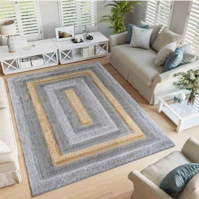 Serdim Rugs Modern Soft Bordered Design Hand Carved Shiny Shimmer Living Room Polyester Shaggy Rugs, Ochre, 120x170cm (4'x5'6")