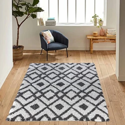 Serdim Rugs Morrocan Berber Living Room Distorted Checkered Design Shaggy Area Rugs, Dark Cream, 80x150cm (2'6"x5'0")