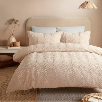 MATERIAL COMPOSITION: Crafted from 100% recycled polyester fabric with an elegant embossed curved and wave design on the face, complemented by a plain-dyed reverse side. SET CONTENTS: Complete bedding ensemble includes one Super-King size duvet cover (260cm x 220cm) and two matching pillowcases (76cm x 48cm). DESIGN FEATURES: Textured face showcases sophisticated curved and wave patterns, finished with a refined button closure for secure fastening. CARE INSTRUCTIONS: Machine washable - turn inside out, wash with similar colours, tumble dry on cool setting, and iron on reverse at low temperature. DIMENSIONS: Super-King duvet cover measures 260cm in width by 220cm in length, perfectly sized for standard UK Super-King beds.