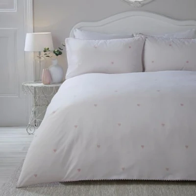 Introducing the Decorative Heart Duvet Cover Set by Serene - a celebration of love, elegance, and tranquillity. With its small printed blush hearts and delicate ric rac trim, this set embodies romance and sophistication. The plain reverse offers a serene canvas for peaceful dreams. Made with the utmost care and attention to detail, our soft-as-feathers fabric caresses your skin, ensuring a blissful night's sleep. Fall in love all over again with the Decorative Heart Duvet Cover Set - the perfect ode to simple elegance. Serene brings contemporary colours and tantalising textures to ensure that the reassuringly simple styling remains an irresistible choice. Plain-dye bedding that is anything but plain. Fits a standard UK Double duvet quilt size: 200cm Width x 200cm Length (79x79") - Pillowcase size 76cm x 48cm Fabric: 100% Polyester | Care: Wash Before Use, Wash Dark Colours Separately, Cool Tumble Dry, Cool iron , KEEP AWAY FROM FIRE Pack Contents: 1 x UK Double Duvet Cover and matching 2 x Pillowcases