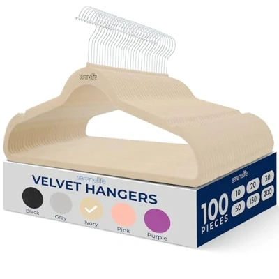 SereneLife 100 Pieces Velvet Hangers Space Saving Heavy Duty Slim Suit Clothes Hanger Set with 360 Degree Swivel Metal Hook, Can Hold Up to 10 Lbs. For Coats, Jackets, Pants & Dress (Ivory)