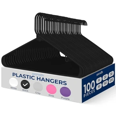 SereneLife Plastic Hangers 100 pcs, Non Slip Heavy Duty Clothes Hanger Set with 360 Swivel Hook, Smooth Finish to Protect Fabric, Lightweight, Ultra Thin for Coats and Other (Black)
