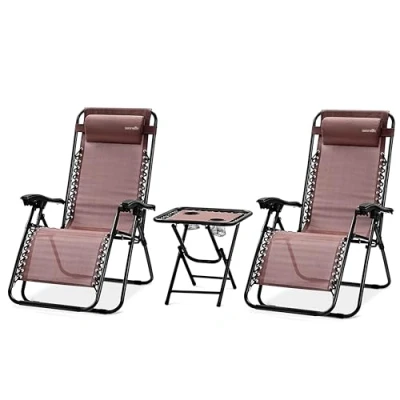 RELAX IN STYLE WITH SET OF 2 – Enjoy ultimate comfort with these breathable garden chairs featuring removable headrests. Perfect for patios, poolside, backyards or any outdoor space. LOCKABLE ZERO GRAVITY RECLINE – Glide into ergonomic reclined positions with elastic bungee cords adjusting to your weight. Lockable recline ensures a secure, stable seating experience. INCLUDED FREESTANDING SIDE TABLE – Features two cup holders and space for your phone or tablet. Ideal for keeping essentials close while relaxing outdoors. DURABLE STEEL AND TEXTILENE CONSTRUCTION – Weather-resistant fabric and sturdy steel frame support up to 120kg, providing reliable stability indoors or outdoors. LIGHTWEIGHT AND PORTABLE DESIGN – Folds compactly to 88 x 65 x 10cm for easy storage and transportation. Perfect for camping, beach trips, or garden use.