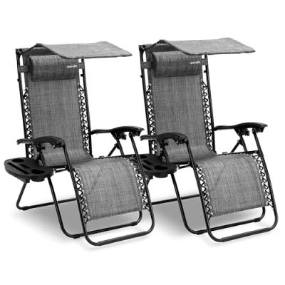 SereneLife Zero Gravity Lounge Chair, Adjustable Steel Mesh Recliners, with Canopy, Removable Pillows and Cup Holder Side Tables, Set of 2, Gray