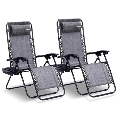 SereneLife Zero Gravity Lounge Chair Set of 2 Adjustable Recliners with Removable Padded Headrest Pillows, Cup Holders, Breathable Mesh Fabric, Lightweight and Foldable, Gray