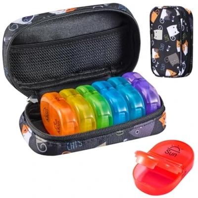 PILL ORGANISER: The weekly pill box organiser consists of a canvas case and 7 pill boxes. The pill boxes 7 day 2 times a day has 2 compartments that mark days of the week and AM/PM icon, making it easy to keep track of what medication you have taken or forgotten. Each compartment holds approximately 6 fish oils or 7 vitamins. Please note: there are different patterns, some come with 7 rainbow color pill boxes, while others come with 7 black color pill boxes. UNIQUE DESIGN: The medication organizer is designed with a zipper case and 7 day pill boxes with snap fit feature for double protection. After closing, the pills will not easily fall off. The inner of the tablet organiser has an elastic mesh pocket, which can hold prescription copies, medical cards, small items, etc. The zip closure on the pill case keeps all medications secure and in one place while protecting your medication privacy. HIGH-QUALITY AND SAFE MATERIALS: The plastic tablet box is made of solid food-grade BPA FREE materials with no pungent smell, ensuring safety for medication use. The pill box uses high-end silk screen printing technology, so there is no need to worry about the label being erased. The canvas case is soft and durable, and there is a high quality and smooth zipper. The zipper pill case provides a well closed storage environment to prevent your pills from getting damp. CONVENIENT TO CARRY: The travel pill organiser is lightweight and portable. The medicine organiser overall size:15.3*9*5.4 centimeters. It is suitable for carrying into suitcases and backpacks during travel, business trips, vacations, etc. Each box size: 7.1* 4.3 * 1.8 centimeters. If you only need a daily supply, just take one and carry it in your pocket or purse, not the entire pill case. The travel pill case gives you convenience by reducing the number of pill bottles and packaging. IDEAL CHOICE: The weekly pill box 7 day with canvas case is not only practical but also has a stylish appearance, which has multiple colors and different exquisite patterns for your choice. They are perfect as a gift to family or friends on Christmas, Mother's Day, birthdays etc. Great for protecting their health, and making daily medication management easier.