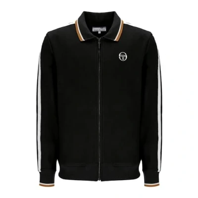 CLASSIC DESIGN: Black track jacket featuring full-zip front closure, ribbed collar with gold and white trim, and signature white side stripes for a sporty look BRAND HERITAGE: Authentic Sergio Tacchini sportswear with embroidered logo on chest, combining Italian style with athletic functionality PREMIUM CONSTRUCTION: Durable fabric with ribbed cuffs and hem for optimal fit and comfort during casual or athletic wear VERSATILE STYLING: Perfect for sports, casual outings, or everyday wear, easily paired with track bottoms or casual trousers DISTINCTIVE DETAILS: Contrast striping on sleeves, premium zip hardware, and signature tri-colour collar detailing for authentic athletic appeal