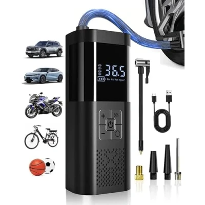 1.FAST & SAFE INFLATION: No more long inflation times, car tyre inflator air compressor can inflate a 195/55/R15 car tyre from 0 to 35psi in 5 minutes. Simply set the desired pressure and the SM02 tyre inflator automatically shuts off when the target pressure is reached. No need to worry about over-inflating! 2.FLASHLIGHT & DIGITAL DISPLAY: The car tyre pump is equipped with 3 modes of LED lights (light/strobe/SOS). The super bright light helps you to inflate and change tyres at night, the strobe and SOS modes are useful for emergency rescue. This air compressor tyre inflator has a large digital display that shows accurate data in real time, so you can understand the tyre pressure at a glance! 3.MULTIFUNCTION: The SM02 car tyre inflator air compressor comes with 4 additional auxiliary nozzles to meet your various needs. Can be used to inflate a variety of vehicles, such as cars, motorcycles, bicycles, bikes, can also be used to inflate the ball, swim ring, other inflatable boats. 4.EASY TO CARRY: The car tyre inflator air compressor measures only 6.9*3*2.2 inches and weighs only 0.92 pounds. It takes up so little space that you can store it anywhere - in your car, in your rucksack, even in your bag. In addition, it is also a good helper when travelling and can be used as an emergency power source for your mobile phone, as there is a USB output on the underside. 5.PORTABLE DESIGN: Our air pump for car tyres is small and lightweight, allowing you to easily carry and work, inflate your car tires at any time. Its extended hose provides greater flexibility during use. In addition, the electric tyre pumps for cars comes with a storage bag, which can be easily stored in your car, backpack or bicycle rack, perfect for outdoor travel, easy to store and carry.