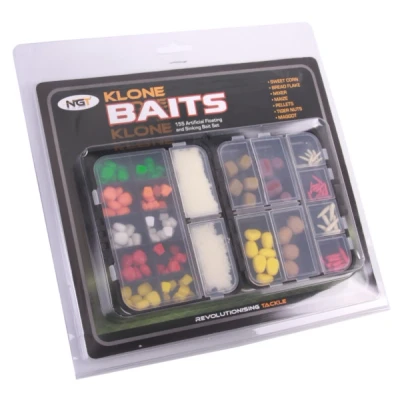 The NGT Klone Baits are artificial bait imitations in the form of bread, corn, pellets and maggots. The set contains 155 pcs and many different colors, shapes and sizes of which some are floating and some sinking.