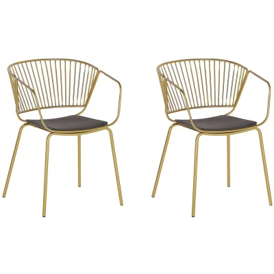 General description Give your dining room an upgrade with the Set of 2 Dining Chairs RIGBY, featuring a stylish metal wire design in a glamorous gold finish. These chairs are inspired by industrial forms and are made from robust yet surprisingly light metal, offering a wide wire backrest and seat for optimal comfort. The glossy gold finish and slender legs allow them to blend seamlessly with any modern decor. Each chair comes with faux leather seat pads in a complementary black color. Technical specifications Product Type: Dining Chair Style: Industrial General Color: Gold, Black Frame Colour: Gold Main Material: Steel Additional Material: Faux Leather (100% PU Leather) Legs Material: Metal Seat Material: Faux Leather Armrests: Yes Finish: Powder Coated Stackable: No Dimensions: Armrests Height: 68 cm, Depth: 49 cm, Seat Height: 44 cm, Width: 54 cm, Height: 77 cm, Seating Surface: 35x38 cm Weight: 7 kg Weight Capacity: 100 kg Offer Includes: 2 x Chair Installation Partial Assembly
