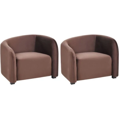 Modern Velvet Set of 2 Accent Chairs. This set of 2 armchairs combines modern style with comfortable seating, making it a standout element in any living room. Eucalyptus wood frame provides stability, while the soft velvet upholstery enhances comfort with its generously sized seat. The curved silhouette and barrel-inspired form add a contemporary touch. Fully upholstered on all sides, each armchair can be positioned anywhere in the room, serving as an eye-catching focal point. Details: Product Type: Armchair Style: Modern General Color: Brown Shade: Dark Brown Material Type: Fabric Main Material: Velvet Additional Material: Eucalyptus Wood Filling Material: Foam Legs material: Wood Seat Material: Velvet Material Composition: 100% Polyester Arm Style: Track Armrests: Yes Leg Caps/ Pads: No Pattern: Solid Reclining: No Seat Construction: Elastic Belt Seat Foam Density: 28 kg/m3 Dimensions: Armrests Height: 62-72 cm Depth: 86 cm Seat Thickness: 40 cm Seat Height: 45 cm Width: 95 cm