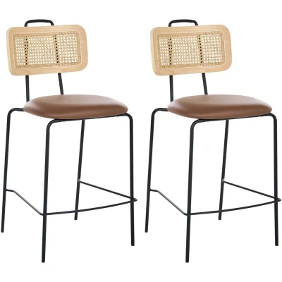 Set of 2 Bar Chairs Iron Legs PE Rattan Back Faux Leather Seat Armless Leg Caps Modern Boho Design Brown Adel