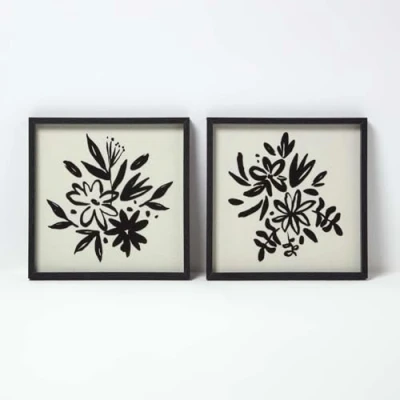 ABSTRACT WALL ART: 2 beautifully embroidered floral design in black thread on natural linen. A sophisticated statement piece which adds a modern touch to any space. Includes 2 framed wall art. Measures 30x30cm each. EXPERT CRAFTSMANSHIP: Crafted with intricate embroidery on high-quality linen fabric, these bedroom wall art showcases fine detailing and precision stitching. Set in a sleek black MDF frame with a glass front, ensuring protection from dust and fading. A COHESIVE SET: This pair of framed floral wall decor complements each other perfectly. The matching black frames unify the look, creating a harmonious display whether hung side by side or separately in different areas. VERSATILE FOR ANY ROOM: Ideal pictures for living room, bedroom wall art, home offices or wall art for hallway and stairs. Its neutral colour scheme makes it easy to blend with various home interior. A BRITISH COMPANY: With over 24 years of experience in the UK and Europe, Homescapes is a trusted name in affordable luxury home décor and accessories. Explore our curated collection of high-quality decorative essentials, and stylish storage solutions to add elegance and functionality to your space.