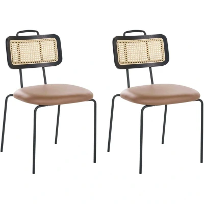 Set of 2 Chairs Iron Legs PE Rattan Back Faux Leather Seat Armless Leg Caps Modern Boho Design Brown Adel