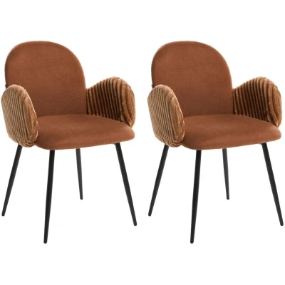Upholstered Chairs with Plushy Jumbo Velvet Armrests. This set of two dining chairs offers a chic retro look with its high-quality fabrics that bring both comfort and style to your space. The upholstery on the seat and backrest is sturdy, making it practical during everyday use. The plush, soft-to-the-touch armrests add a cosy accent, while the sleek iron legs provide modern stability. A perfect addition to any dining room or living area, blending comfort and sophisticated design. Details: Product Type: Dining Chair General Color: Brown, Black Material Type: Fabric Main Material: Fabric Additional Material: Sponge Legs material: Metal Seat Material: Fabric Material Composition: 3% Nylon Armrests: Yes Finish: Powder Coated Stackable: No Dimensions: Armrests Height: 68 cm Depth: 56 cm Seat Height: 40 cm Width: 50 cm Height: 84 cm Seating Surface: 47x49 cm Weight: 7 kg Weight Capacity: 150 kg Offer Includes: 2 x Chair Key Features: Incredibly Soft, Retro Style, Creates a Cosy Atmosphere,